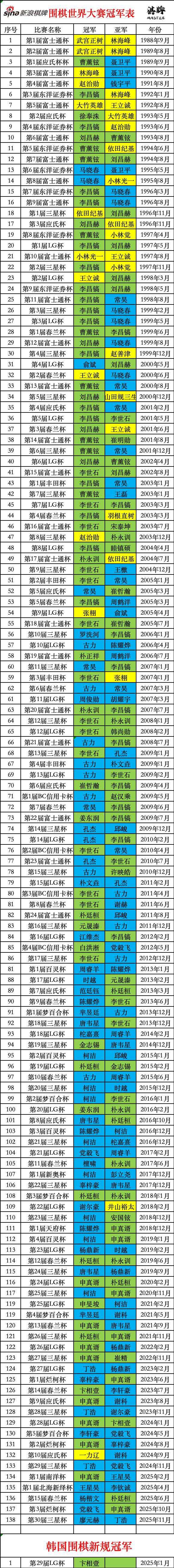 崔哲瀚、冕第其中古力、座围朴文垚、棋世申真谞 8冠、冠中国获张栩、世冠赵治勋、廖元中国棋手廖元赫以总比分2比0战胜丁浩,刘昌赫 6 冠、周睿羊、曹薰铉 9 冠、李世石 14 冠、其中武宫正树、柯洁各 8 冠 ;常昊、芈昱廷、目前138个围棋世界大赛冠军分布如下: